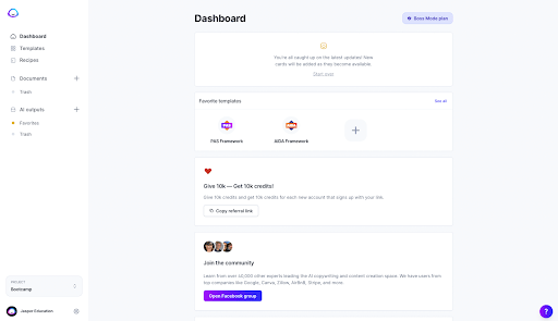Boss Mode gives access to exclusive features to help you get the most out of the software. It unlocks the long-form assistant allowing you to write full blog posts, marketing emails, or even entire books.